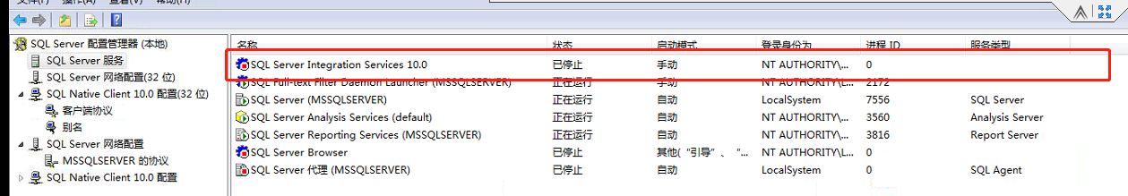 點擊:程序 -- Microsoft SQL Server -- 配置管理器,將SQL server integration services 10.0 ,狀態修改成停止,啟動模式選擇成手動