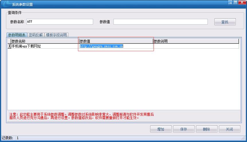2、在【系統(tǒng)參數(shù)設(shè)置】中通過(guò)系統(tǒng)名稱(chēng)查找到參數(shù)名稱(chēng)是【手機(jī)端APP下載地址】