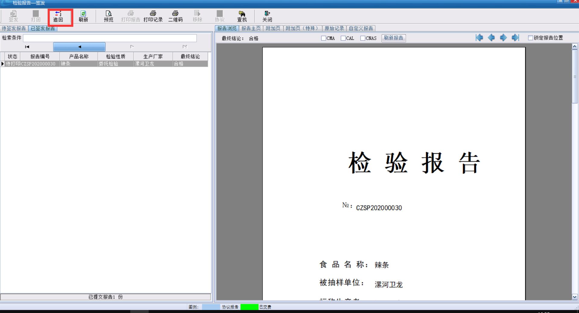 如果報告已經到了報告打印,我們發現該份報告有錯誤,我們需要登錄簽發人(該份報告)的賬號,打開報告簽發,我們可以在任務欄中找到已簽發報告,選擇要追回的證書,點擊上方追回,然后在進行打回。