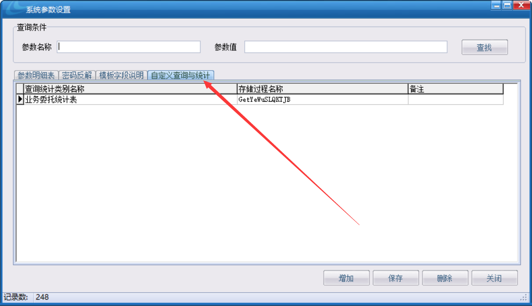 3.使用系統管理員賬號登錄,在【系統設置中心】→【系統參數設置】中設置自定義報告的名稱和所使用的存儲過程的名字。點擊保存。