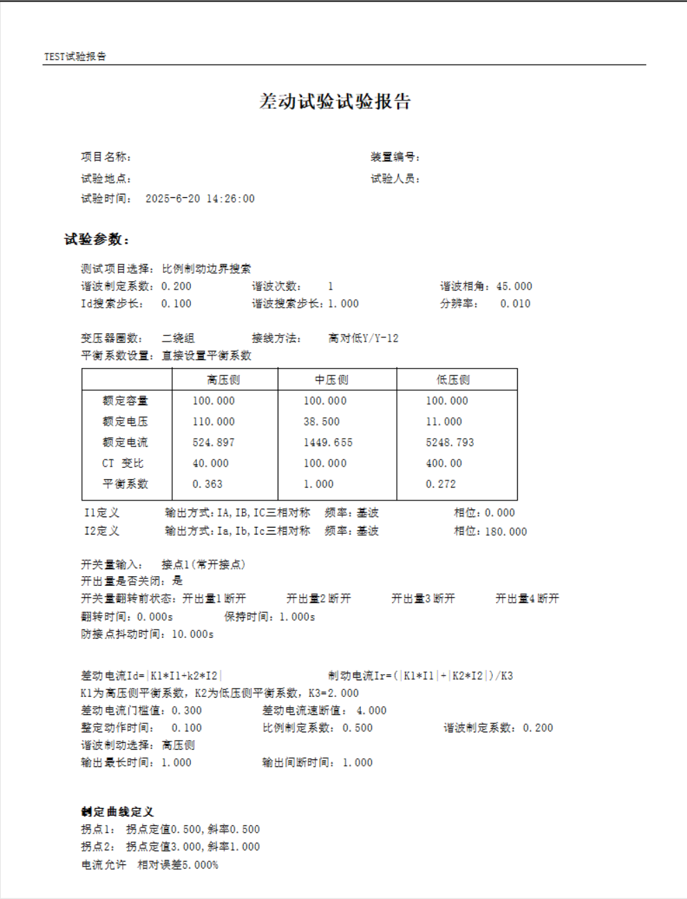 試儀型號、被測試差動保護裝置型號等)、試驗步驟、試驗結果、結果分析以及結論等內容。在結論部分,應對保護裝置的差動保護